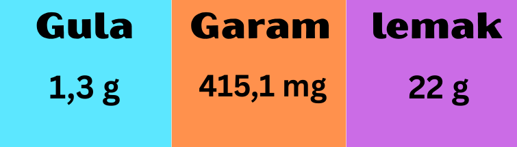 Dalam 1 sajian (350 gr) terdapat kandungan natrium 415,1 mg/2.000 mg (21%) dan lemak 22 gr/67 gr (33%) dari batasan harian kemenkes.