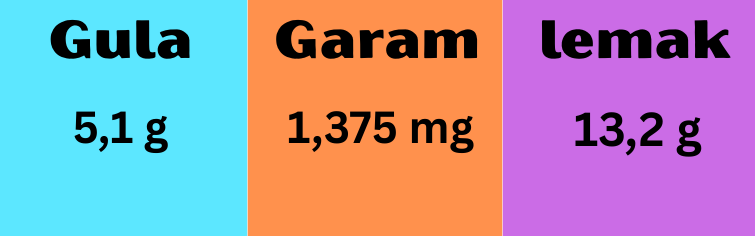 Dalam 1 sajian (350 gr) terdapat kandungan natrium 1.375 mg/2.000 mg (69%) dan lemak 13,2 gr/67 gr (20%) dari batasan harian kemenkes.