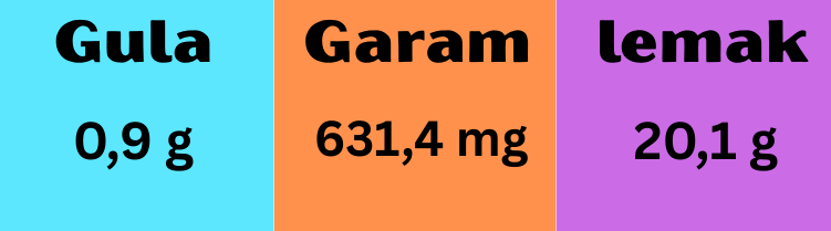 Dalam 1 sajian (400 gr) terdapat kandungan natrium 631,4 mg/2.000 mg (31,5%) dan lemak 20,1 gr/67 gr (30%) dari batasan harian kemenkes.