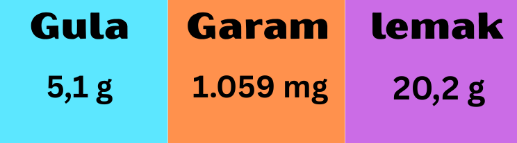 Dalam 1 sajian (340 gr) terdapat kandungan natrium 1.059 mg/2.000 mg (53%) dan lemak 20,2 gr/67 gr (30%) dari batasan harian kemenkes.