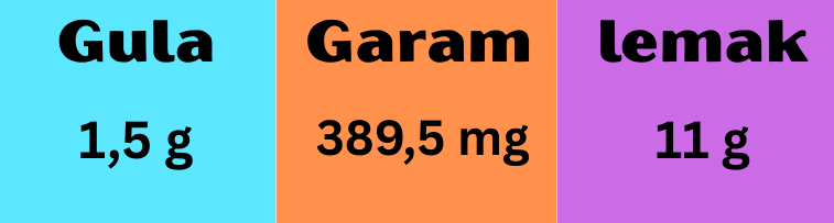 Dalam 1 sajian (270 gr) terdapat kandungan natrium 389.5 mg/2.000 mg (19%) dan lemak 11 gr/67 gr (16%) dari batasan harian kemenkes.