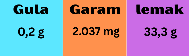 Dalam 1 sajian (220 gr) terdapat kandungan natrium 2.037 mg/2.000 mg (102%) dan lemak 33,3 gr/67 gr (50%) dari batasan harian kemenkes.