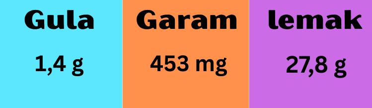 Dalam 1 sajian (240 gr) terdapat kandungan natrium 453 mg/2.000 mg (22,6%) dan lemak 27,8 gr/67 gr (41,5%) dari batasan harian kemenkes.