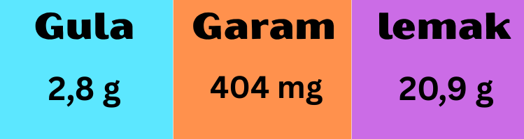 Dalam 1 sajian (350 gr) terdapat kandungan natrium 404 mg/2.000 mg (20%) dan lemak 20,9 gr/67 gr (31%) dari batasan harian kemenkes.