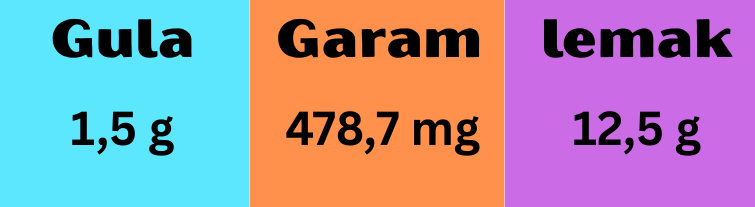 Dalam 1 sajian (325 gr) terdapat kandungan natrium 478,7 mg/2.000 mg (24%) dan lemak 12,5 gr/67 gr (18,6%) dari batasan harian kemenkes.