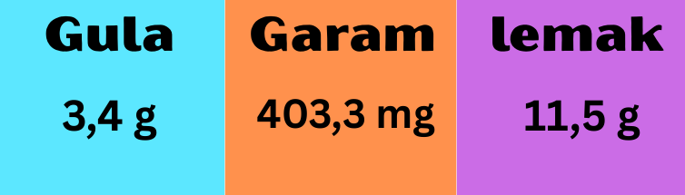 Dalam 1 sajian (280 gr) terdapat kandungan natrium 403,3 mg/2.000 mg (20%) dan lemak 11,5 gr/67 gr (17%) dari batasan harian kemenkes.