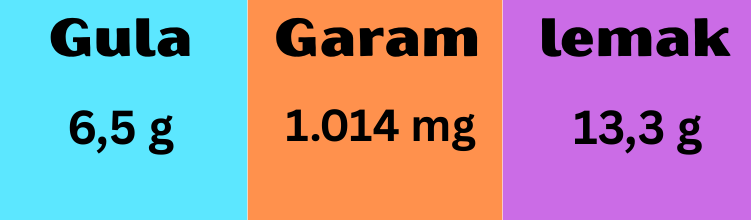 Dalam 1 sajian (300 gr) terdapat kandungan natrium 1.014 mg/2.000 mg (51%) dan lemak 13,3 gr/67 gr (20%) dari batasan harian kemenkes.